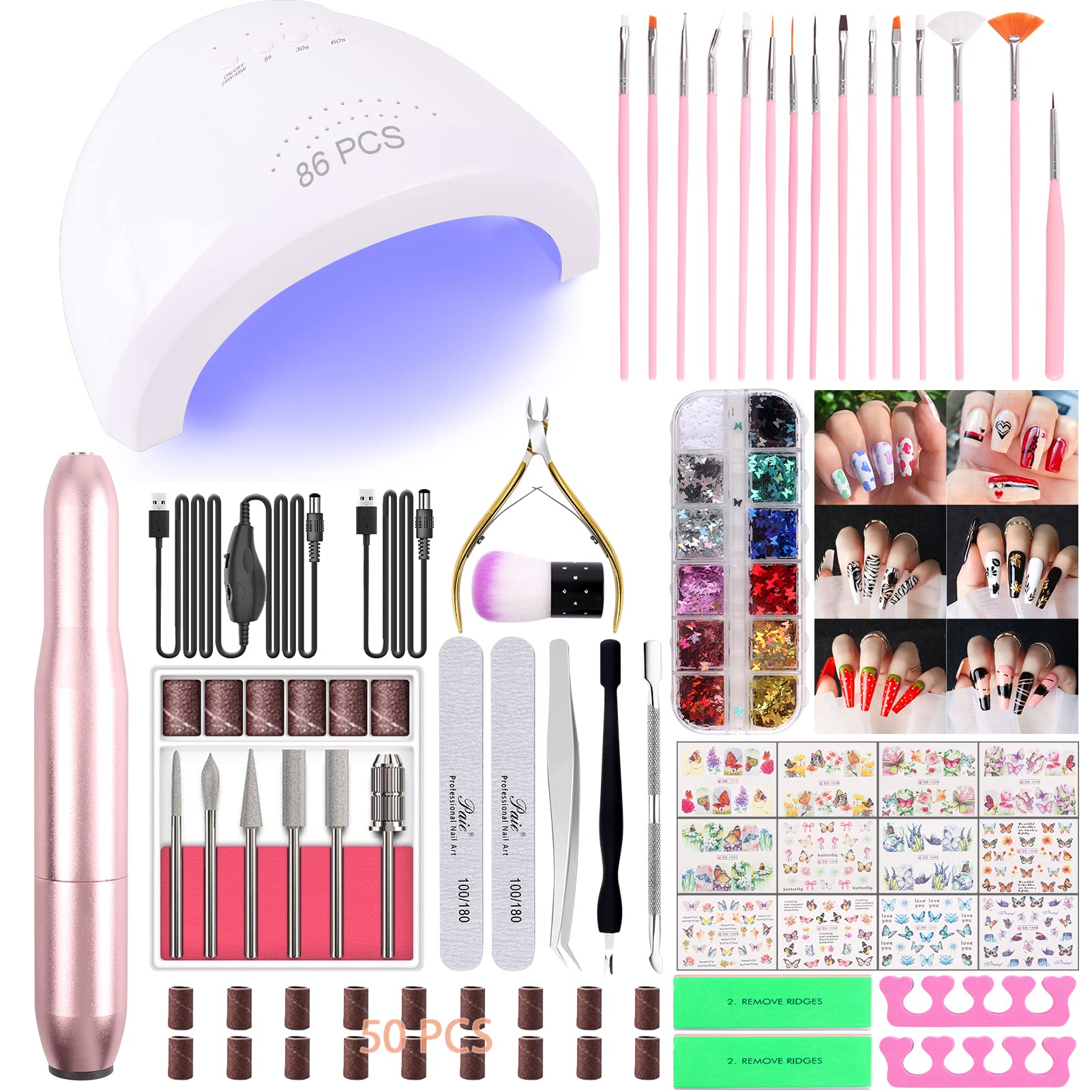 - 【Professionals Nail Art Kit】This manicure kit can be used for beginners or professionals: 24/48W UV Naillamp *1, Electric Nail File*1, Nail Art Brushes*15,Nail Decoration *2Set, Nail Buffer Block*2, Soft Dust Brush*1, 100/180 Nail Files*2, Pink Toe Separatop*2, 180# Sanding Rings*50,Cuticle Trimmers*1, Cuticle Pusher*2