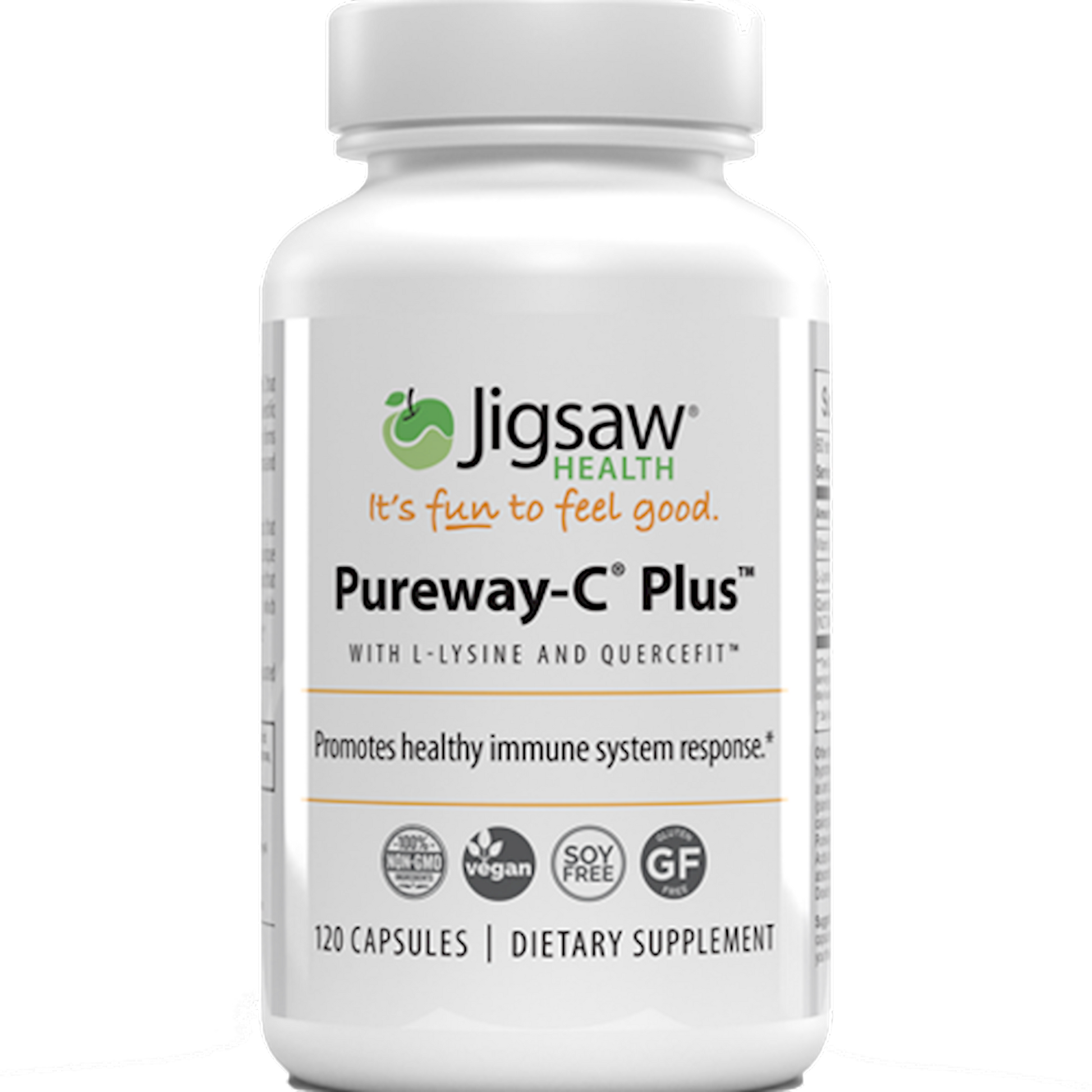 What is Pureway-C Plus New and improved. Dont worry...its still the same great clinically tested Vitamin C (as Pureway-C) and still includes L-Lysine, but Jigsaw has added something else to make it even better and more effective Quercetin.* Quercetin is a bioflavonoid that is complimentary to Vitamin C and helps promote immune function, heart health, and skin health!* But thats not all...Jigsaw is using a special form of Quercetin that uses a proprietary delivery system to enhance absorption of Quercetin, which makes it more effective than ordinary forms in promoting better immune, heart, and skin health!* What can Pureway-C Plus help me with* Support the immune system function* Support collagen to provide essential support for the blood vessels, arteries, ligaments, bones, gums, and teeth* Support healthy metabolism and energy production by making carnitine, the amino acid responsible for transporting fat to mitochondria for conversion to energy* Support eye health* Support healthy heart function and overall cardiovascular health* Regenerate other antioxidants like vitamin E and CoQ10* Neutralize oxidative damage caused by free radicals and protect cells from wear and tear* Support artery and blood vessel flexibility* Support adrenal gland function, which uses large amounts of Vitamin C, to support the body's healthy stress response* Support brain function and stable mood* Supports wound healing* Why is Jigsaw Pureway-C Plus a superior form of Vitamin C* Pureway-C is a clinically tested form of Vitamin C shown to outperform other leading forms of Vitamin C. Research studies in vitro and in humans show that Pureway-C is more rapidly absorbed and more highly retained in the human cells resulting in faster, more beneficial effects than other brands.* Pureway-C combines ascorbic acid with several types of lipid metabolites (fats derived from vegetable sources) and bioflavonoids (antioxidants) to enhance bioavailability. Lipid metabolites, function as carriers of the ascorbic acid to increase intestinal absorption, allowing Vitamin C to enter the cells quickly for enhanced cellular uptake. Bioflavonoids greatly contribute to the antioxidant capability of Pureway-C as well as enhanced absorption in the intestinal tract.* 4 Ways Pureway-C is a superior form of Vitamin C: More highly retained in the human body by 233% Able to support healthy neurons 12 times more rapidly Offers more efficient immune protection from toxins by 2.5 times A 12% higher antioxidant effect Why is Lysine included Lysine, or L-Lysine, is an essential amino acid, which means that it is necessary for human health but cannot be made by the body. Amino acids are the building blocks of protein. Lysine is important for proper growth, and it plays an essential role in the production of carnitine; a nutrient responsible for converting fatty acids into energy. Lysine appears to help the body absorb and conserve calcium, and it plays an important role in the formation of collagen.* Lysine supports a healthy immune system response. Taking Lysine supplements can support recovery time. Lysine also plays a role in supporting arterial health. Lysine is one component of a protocol proposed by Linus Pauling to promote optimal heart and immune health.* Why is Quercetin included Quercetin (as Quercefit) is a clinically tested bioflavonoid that is complimentary to Vitamin C and uses phytosome technology to enhance absorption to further promote immune function, heart health, and skin health!*