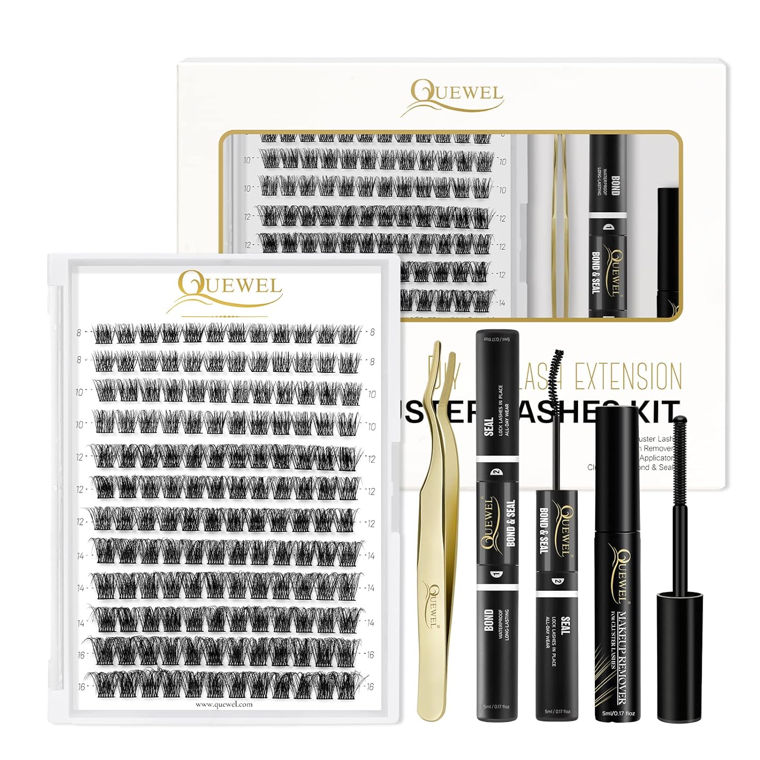 QUEWEL DIY Eyelash Extensions Kit, Lash Clusters 144 Pcs, Clusters Eyelash Applicator Tool, Super Hold Cluster Lashes Bond and Seal, Glue Remover Easy to Apply at Home(S012-Kit)